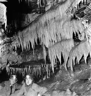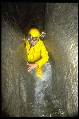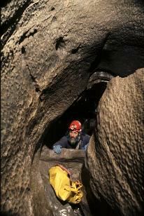 Downstream a climb up a muddy boulder slope up to the right or alternative route following the stream leads to a twisting canyon passage which descends numerous cascades. This is LOWER PIERCES PASSAGE. Half way along here a route descends from the roof from COTTON CHAMBER. Gradually the gradient flattens out and a drop in the roof is followed by a climb up into a mud floored section, lowering to a crawl. A hole in the right hand wall leads to WRETCHED RABBIT PASSAGE.