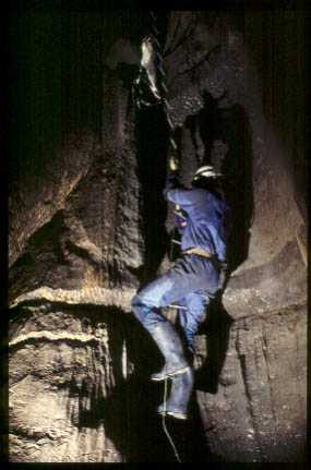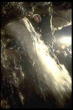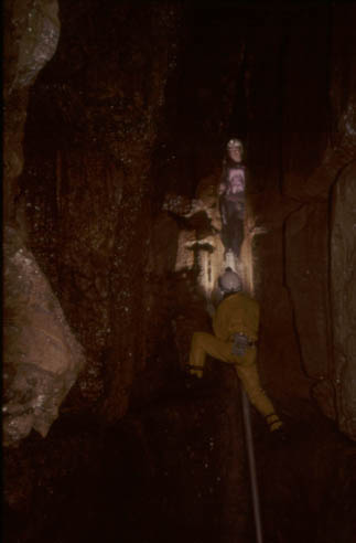 A short crawl at the head of the chimney leads to a 3 metre drop down into a separate stream passage, upstream leads to a complex route to a link with CARROT CHAMBER or alternatively the UPPER TRIDENT SERIES and hence back to SPOUT HALL.