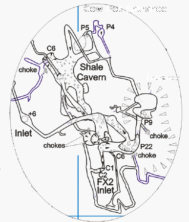 Leading off the entrance shaft are several short inlet passages including FX5 INLET. This is up the rock slope off to the right of the bottom of the pitch, and is s series of short climbs up into avens and a balcony overlooking the open pot. From here a bedding leads to a stream inlet which can be followed over a blind 6m pot to end in two avens.