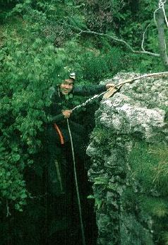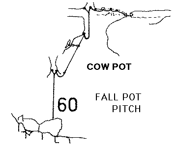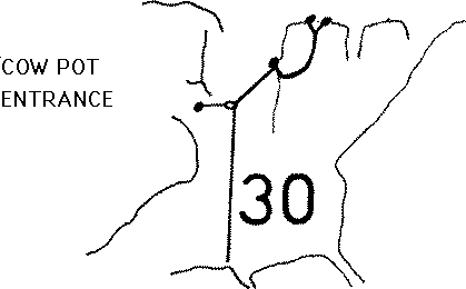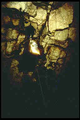 The next passage out of Shale Cavern is up on a shelf in the washed out shale band. Continuing past a hole in the floor leads to a junction, the way to the left spirals back round into the chamber or continuing on to the top of a short 6m pitch. To the right continues as a stooping walk to a further junction. To the left here leads up an inlet to a choke very close to the foot of the entrance shaft waterfall, whilst to the right is a squeeze and a 2m climb down into a small chamber, the only outlet being an impassable slot taking the stream.. The final exit from the chamber is the one that connects with the left hand branch of the above passage, but to one side is an opening onto a 4m pitch. From the foot of this a short crawl leads to an acute corner and a short drop into a small chamber. The way on is an awkward squeeze in the right hand wall which immediately arrives at the lip of another 4m pitch. A small chamber at the foot of this leads to a very narrow rift passage which become too tight within a few metres. This has been dug but gets too narow.