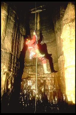 Almost opposite the bottom of the pitch a large, meandering passage descends several short cascades to where the roof lowers, and a short crawl continues over large cobbles to a wide low chamber formed in a washed out shale band, Shale Cavern. A number of passages radiate from here, the first one being on the left of the point of entry to the chamber is a short crawl running back in the direction of the entrance and soon chokes. Only a few metres round the wall in the chamber is another passage which starts as a short crawl in a phreatic tube several metres above the floor level. Moving on round the chamber a hole in the floor down through large boulders is met. This leads down a 6m shored climb and a descending rift passage towards the sound of falling water. The way on is an awkward passage followed by a tight rift. This leads out over a 12m pitch which is tight at the top. This is the top of the final aven of AARDVARK COUNTRY in LANCASTER HOLE.
