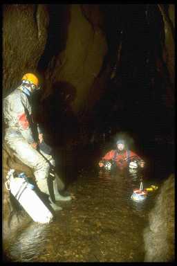 THE SUMP. The initial investigations here failed to find a way on, however, 25m from base a large pebble-floored bedding at -11m depth leads off on the right hand side of the sump pool. From here a passage averaging 1m high and 7m wide continues to 142m from base. Here the roof and walls disappear as the passage enters a huge underwater chamber containing a steep slope of debris. A rift in the roof here has been ascended to -1.5m depth and following the spectacular underwater ramp down straight ahead ends at a narrow rift at -28m depth. However, a route to the right at -15m depth descends to the bottom of the slope to enter a magnificent scalloped tunnel (The Metro) at -32m depth. This large passage heads generally south south west and by following the right hand wall leads over a cobbled floor until the depth gradually decreases to -31m at 275m from base. The route ahead continues in a passage at least 5m wide and 3m high (and often much larger) and passes numerous whalebacks of pebbles, the depth varying between -30 m and -32m. An excursion into the roof at 425m attained a depth of -21m but the roof was still out of sight. The large passage continues to the present limit of exploration at 650m from base and -29m depth. Here the passage is 9m wide and 5m high. This point is 220m from the furthest explored upstream limit in Leck Beck Head and 300m from the resurgence at Witches Caves