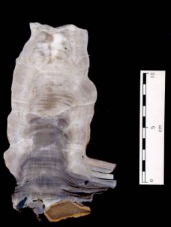 Photograph 1. Top section of a vertically sliced stalagmite from Lancaster Hole. The top of this slab has been uranium dated to have been deposited 3,572±79 years before present. |