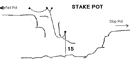 At the end of this is MAIN LINE TERMINUS. This is a complex three way junction. The first on the right is the other end of MAINLINE PASSAGE, next to this also on the right is the start of MANCHESTER BYPASS the flood escape route out of EASE GILL via COUNTY POT, whilst straight ahead leads through a crawl to enlarge again and end in CARROT CHAMBER, a passage in the right wall just before the end of CARROT CHAMBER leads off to OLD ENGLISH CHAMBER and another connection to the MANCHESTER BYPASS.