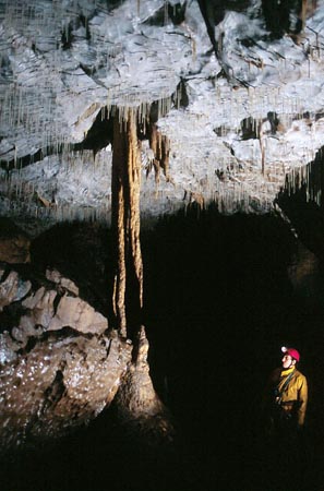 Back in UPPER SNAIL CAVERN on the right wall here is a 8m fixed rope up to SIDELINE PASSAGE. This provides a link with MANCUNIAN WAY at the SURPRIZE. A few meters further on up a 8m climb on the right wall is the entry to MAINLINE PASSAGE which provide an alternative route to MAIN LINE TERMINUS normally reached by following the large open passage to where it splits into four separate passages.