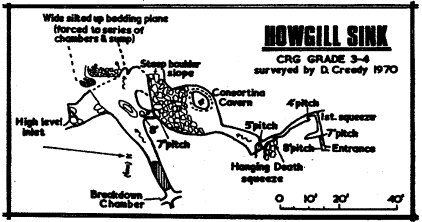 The entrance is surrounded by boulder dam in the left bank of EASE GILL below the confluence with HOWE GILL. Small climbs drop to the first squeeze into a wider passage and the HANGING DEATH SQUEEZE past loose blocks in a choke at the entrance to CONSORTIUM CAVERN. At the base of a steep upward boulder slope are two short drops into a wide low streamway. Upstream is a wet crawl to a breakdown chamber. Downstream is a wide silted bedding plane to 46m of easier going to a junction. Straight ahead soon ends in a boulder blockage and choked avens, Whilst the crawl continues for 61m to a low chamber and sump. The far reaches of this cave, connect to THE SILVER STREAMWAY of THE LONE RANGER SERIES in LINK POT