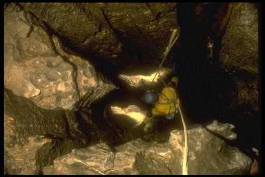 Back in Bridge Hall the hole in the boulders drops into Kath's Way, at the bottom of the drop a low crawl is reached, with a branch off to the right into The Girder Route connecting with Sand Caverns via 7 metre pitch and also with the slot in the floor at the bottom of the Entrance Pitch.