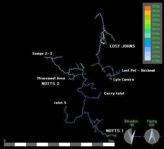 The dig was abandoned in late 1994. Although the horizontal passage at the bottom has no active stream, dribbles here and there had slowly filled the dam up. The survey suggests that it is heading into Lyle Caverns area of Lost John's and since it was being dug for a way into Nott's II that also helped interest to wane.