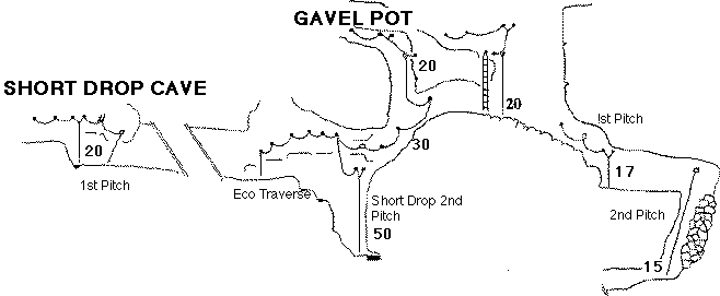 The water from Shale Cavern leads via sumps of 3.3m, 1m and 2.7m to emerge at the top of the Wet Pitch in the lower series. These sumps are liable to become choked with flood debris.