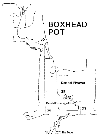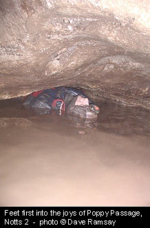 At the bottom of the pitch, a low horizontal passage is intersected and you can go left or right. To the left are the remnants of a dam. Over this, the mud floor starts to shelf downwards towards a corner. At the corner, manoeuvre around the chockstone and you are now in a narrow (2 ft) rift passage with about 0.5m airspace and water more than 2m deep. Jam your way along and round 2 or 3 corners as the passage follows the joint pattern. After 30m or so the rift suddenly narrows in to about 0.2m wide. A significant widening is thought to exist about 5m along this!