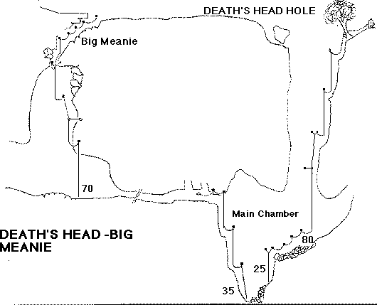 Stream cave containing five short pitches ends at a downstream sump that sometimes contains a small airspace. The water flows to Dolphin Passage in Death's Head Hole some 17m distant. The sump has been passed by bailing from the Death's Head end to allow the through trip between the two caves.