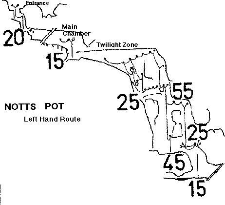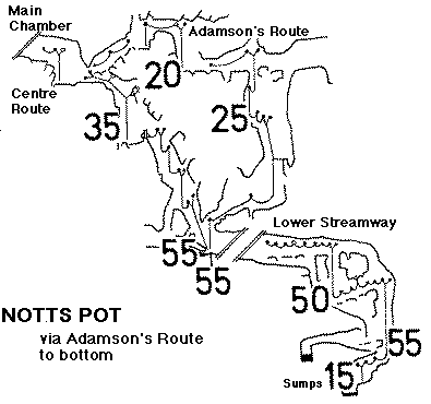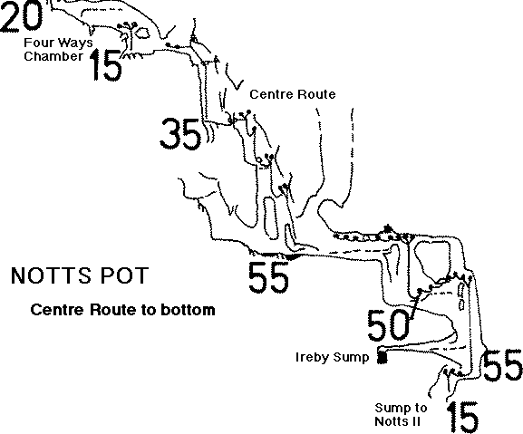 Main Downstream Sump A fine example of a "hopeless old sump" which was passed after reinvestigation to reveal a major part of the Three Counties System. The easiest route to the downstream sump is possibly via the Centre Route. There are two sump pools, one active and the other static. The main active sump closes down at -6m depth. The main way on lies in the "static sump" to the left of the main sump. Here an arch leads into a frothy sump pool in a rift and this is descended to - 9m depth. This is the deepest point in the sump and the main flow of water enters here from the active sump via some impenetrable fissures. From the bottom of the rift a tube leads off to a sharp right hand bend beyond which an eyehole is passed on the right. The route, sometimes low, then meanders around silt banks and passes through a slot to the right at 80 m from base. Beyond, the passage enlarges and turns left and is followed shortly by a T junction. Left here closes down after 10m but a sharp turn to the right at the junction leads to a rise to -5m depth and a descent to -8m depth over a couple of silt banks. Beyond, the passage levels off for the next 5 m where a final cobble slope, which is prone to slump down and block the passage, marks the gradual ascent to airspace in Notts II after a total dive of 210m.