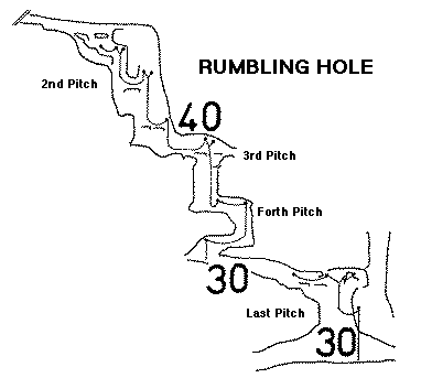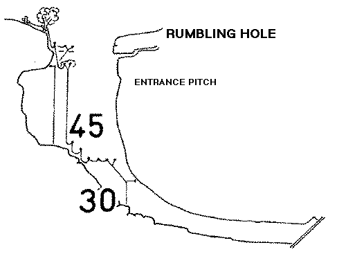 The downstream "sump" is a waterlogged fissure with a diminishing airspace. This has been passed via a short duck to a body-sized canal that leads past five acute bends before emerging in the Rumbling Hole Inlet of Lost John's Cave. An inlet upstream of the terminal sump ends at an undived bedding plane sump.