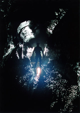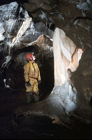 In the mainstream, a canal starts 60m from the sump at a left hand bend and is 40m long. In two places, where the passage turns left, it is necessary to swim. At the downstream end of the canal, many boulders on the passage floor mark the presence of the wet and loose Daylight Aven, just off to the right. Opposite this, a calcite slope leads up to a calcite cascade and a further view up the aven.