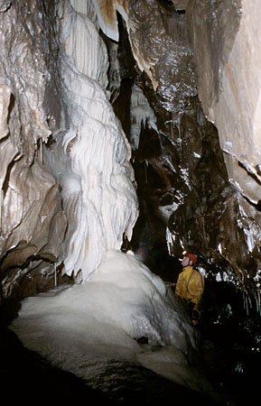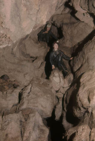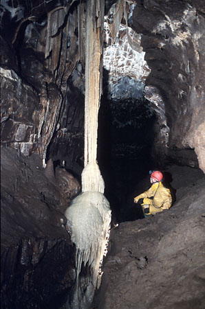At the Nick Point is a rope climb up an 8 metre sandy slope to a dug passage to Estonia Chamber with a fine flowstone cascade.