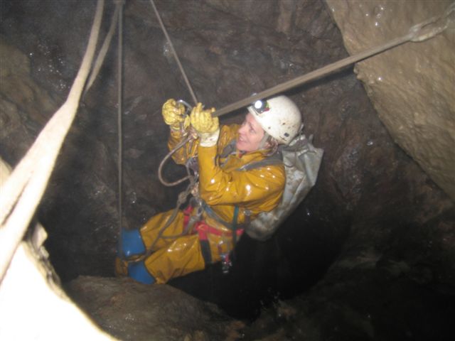 A 20 metre climbable shaft using alloy ladders and concrete blocks leads to a small chamber and round the corner to another 20 metre free climbable shaft. This lands in a chamber and over to the right a 10 metre climb down leads to a low section through to a junction. Up the slope is choked but down the rift is a 6 metre zig zag climb, using the traverse line provided, which is especially useful on the return. At the bottom is a narrow passage for a few metres to a narrow 4m climb down leading to larger passage, which breaks out at Mincemeat Aven after 30m. This is some 15m high with a view into a much higher aven to the east. The eastern aven is some 50 meters high to a roof of boulders. Ten meters up is an unentered passage leading back to the western aven.