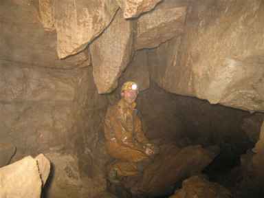 Just before the boulder choke on the left are three low passages joining together and leading to a small active streamway, which is inaccessible but drains to the NCC Series. Just before the three low passages is an aven at a sharp left hand bend. This leads to the RRCPC exrtension, some 100 meters of passage to a 15 metre aven, scaled to 150 meters of inlet passages.