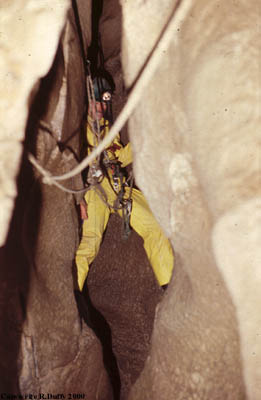At the top of Clunk pitch, it is possible to traverse forward over the head of the pitch and then climb up into a small chamber. A short climb here was scaled into a too tight bedding plane and this is thought the be part of the bedding that forms the bottom of the entrance pitch.