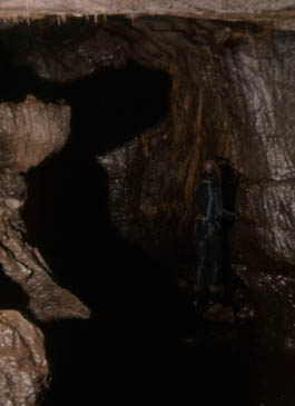Back in the canyon, 30m further downstream Sir Digby Spode's Inlet enters on the right. A short climb rigged with a handline leads to 30m of large muddy passage and an aven. The passage continues to the left and lowers to a short crawl ending at the impenetrable Bruno Kranski's Rising Sump, 100m from the mainstream junction. Scallop marks in the floor suggest that a considerable flow rises from this in flood. The aven (Count Lazlo Stroganoff's Aven) has been scaled for 40m past a ledge where 20 metres of low rift passage leads north west to a small tight drop.