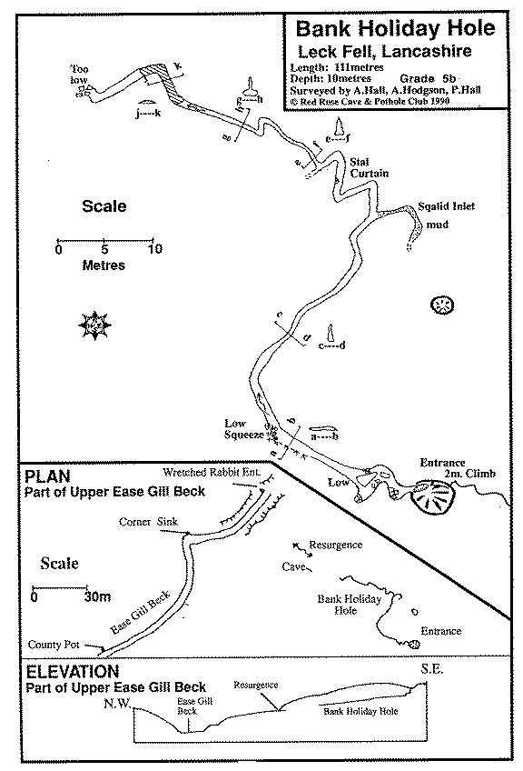 A small cave located on the limestone bench on the east side of EASE GILL. The entrance is in a prominent shakehole, where a stream sinks, about 150m across LECK FELL from the entrance of SLIT SINKS and due south of THE BOREHOLE