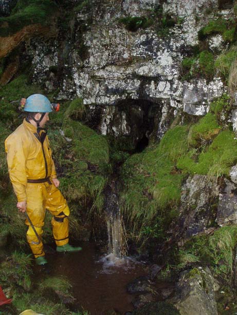 Situated in the true left bank of the gill, just downstream of the pool near Wretched Rabbit entrance, the hole is a narrow, wet and muddy sideways passage for 6 metres. Here a small inlet on the left emerges and just beyond is a widening where another inlet on the left is met. Ahead a small climb reaches a chamber, here to the left a roof inlet enters, straight ahead is a choked rift and to the right the passage is too tight. See photo