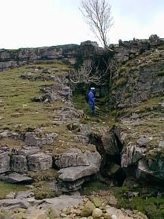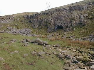 2. NGR SD 6756 8056. Alt 317m. Situated below the prominent scar in bedded limestone. A wriggle through onto wider passage where stream sinks in the floor. Upstream is a pleasant crawl to a series of impassable choked inlets below the surface stream bed. Length 46m