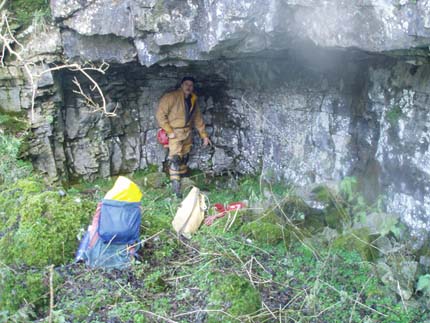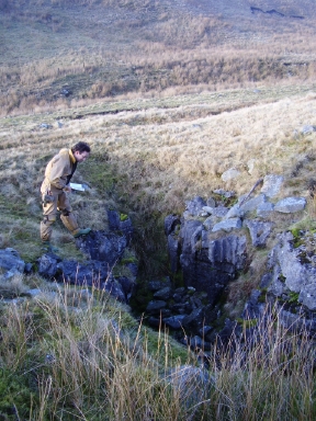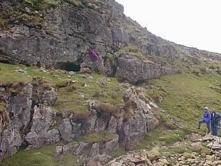 2. The entrance upstream of No.1 and higher in the scar. Stooping passage to a sudden entry into a fine chamber. A climb down overhanging blocks leads to the floor with several blind holes and a short passage, although one of the holes has been descended to a pitch with a very tight take off and no natural belay, down this leads to a rift which heads back under the gill, both directions are blocked by cobbles and boulders but a draft could be detected. Back at the chamber there is a climb up onto a shelf which has two inlets, One a narrow fissure, the other an easy going passage to a small aven. Length 33m