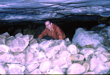 Photo: Pete Muckalt in Entrance of Bank Holiday Hole during its intial exploration. 1984.