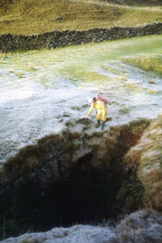 The shakehole with a drainage gully entering, on the opposite side of the track a few metres down from BULL POT of THE WITCHES. A straight 8m climb down leads to a small chamber and a loose boulder choke. At one time a passage through this led into CAVERN 32 in BULL POT of THE WITCHES |