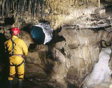 reaches of EASE GILL CAVERNS. The entrance is a small opening on a