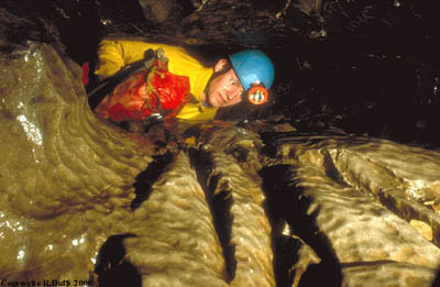 25 metres from the junction a diagonal climb of 6 metres leads to the foot of the awkward chimney into The Baby Feeder Series. Starting in the roof of the main streamway just downstream of Anemolite Junction, the awkward to enter passage begins low with a boulder floor and stream trench below. The way on becomes narrower beyond a stal-covered alcove on the right and soon awkward traversing, above a very tight and blind 13 metre pitch sequence, leads to ‘The Teeth’ formation. This feature forces one to crawl while hugging the left wall in order to pass its constriction and avoid contamination of the stals. From here the passage continues past a small aven and slowly degenerates as it splits into smaller inlets below the pool of Pool Sink entrance.