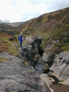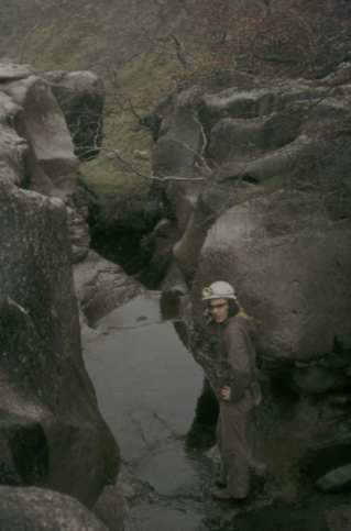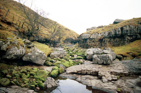 Cow Pot is the only major sink on the shale boundary on Casterton Fell. The stream descends an open shaft and meanders along washed out shale bed to a 45 m pitch from the roof of Fall Pot into Lancaster Hole. The entrance to the latter is close by and consists of a 35 m shaft into the high level passages. To the south side of Ease Gill Beck are other entrances to the system, which consist of another set of high and low level passages interconnected via shafts. Two entrances high on the fell Pippikin Pot and Bye George Pot lead down through constricted immature passages to phreatic trunk routes similar in appearance and level to those in Lancaster Hole. Photo: The normally dry Ease Gill Beck below Cow Dub. |
