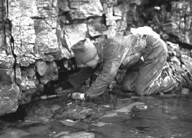 The entrance is situated under the scar on the true right bank of the gill 46m downstream from THE BOREHOLE