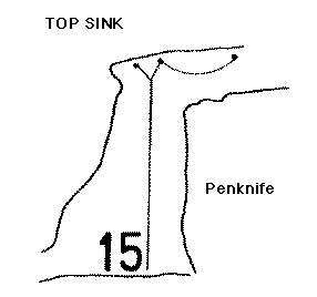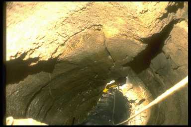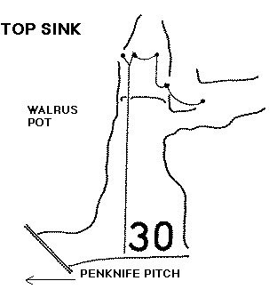 At the foot the passage doubles back underneath itself and continues as an awkward series of bends, hence the name PiR2. The passage finally starts to enlarge, and the 4.5m PENKNIFE PITCH is reached. At the bottom of which is a junction, with WISDOM TOOTH PASSAGE entering on the left. This can be followed via a short climb up into a high and winding streamway which eventually chokes. Just before end is a large inlet on the left and a chimney to the right hand side can be climbed to an exposed step over the top of the waterfall. After a short distance holes in the roof of the stream passage lead up into SURPRISE PASSAGE which continues upstream for 50m to a choke. Back to the right a flat out crawl continues above the holes in the floor. This is the far end of DIRE STRAITS which connects via DANISH PASSAGE to the downstream end of BRADSHAW'S PASSAGE.