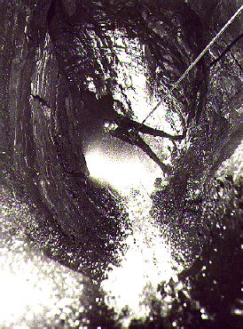 The combined waters at the foot of the PENKNIFE PITCH flow into the long, winding, hands and knees crawl of BRADSHAW'S PASSAGE which eventually emerges at the complex LIMERICK JUNCTION