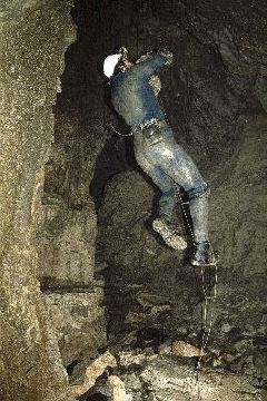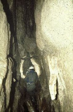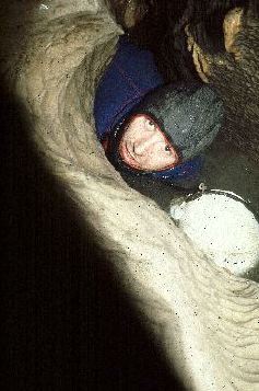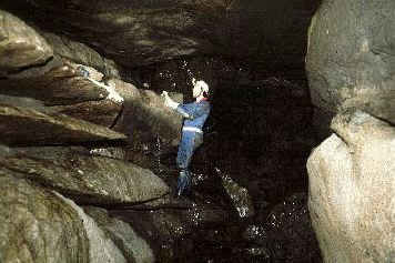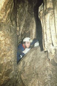 The ducks usually need clearing of rubble and flood debris. From the Second Duck follow along the rift and through an eyehole until a junction is reached after 30m. The inlet to the right becomes too tight after 50m (this possibly connects to 'Slugs' dig in Kath's Way) and the way on is to the left through a 6m long bedding plane duck No. 3. The way on now gets easier as the passage develops into a 6m high meandering streamway for 150m to reach a complex junction.