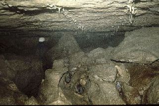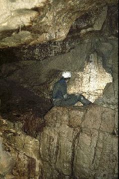 Here all ways close down or loop back, but to the right is a 5m climb up in the main inlet to a bedding plane and a further chimney up into Haemorrhoid Hall. Across the 'grikes' floor the hall is an area of complex inlets, One on the right is a crawl to Pot Pit, a 10m aven, too tight at the top. The main way on is via the first climb on the left, a 10m chimney up to an eyehole opening to BAT CHAMBER. The largest aven in the roof -Bat Aven- is an 8m pitch which intersects another passage. Upstream is the blind Radio Aven with a choked tube at its base, and downstream the passage soon chokes. The only option now is to retrace your step back to FALL POT
