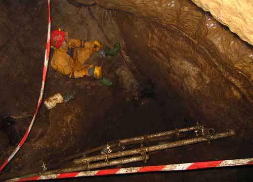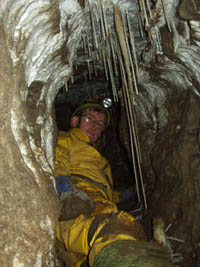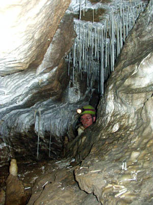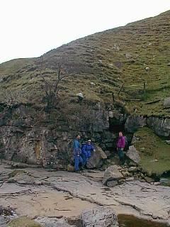 After 30m of twisting and turning passage with some narrow sections at thigh level the stream passes under some boulders. A climb up to the roof here leads to a bedding plane and another hading climb up to a boulder choke. Up and straight on through the boulders leads to a larger chamber and two ways on. To the right through a squeeze is a 10 metre aven with a fixed rope in place. To the left is a sandy dig up an awkward chute to another choked aven - work continues in this area.