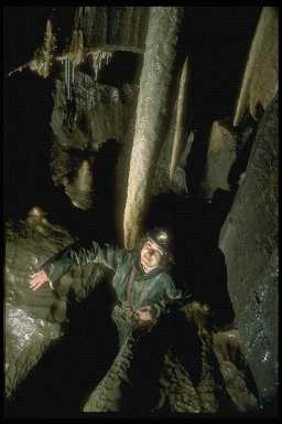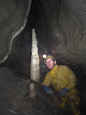 Passage The usual way on from the Big Rift is straight on in a hands and knees crawl leading on downstream and it quickly enlarges to a meandering canyon passage which, after several short climbs down, leads after about 100m to holes in the floor above two waterfalls. By traversing over the holes to the right a parallel streamway is met. A few metres upstream this passage turns sharp right . Here a 4m climb up into the roof leads to a traverse an awkward crawl to a small decorated chamber. which is choked with fill at both ends. A narrow 5m deep slot in the floor leads down into MARBLE CHAMBER. A few yards further upstream the passage bears left up through boulders and the stream is lost in the floor. On the right is a 2m step up followed by a step over a holes in the floor over the stream to a Ulreka Chamber, where a complex of passages continues above and parallel to the main Wretched Rabbit Streamway. Straight on goes to a well decorated chamber with a voice connection in the roof to the upper level. A little further is a junction. Straight on again leads out over a traverse to a 8 metre pitch down into MARBLE CHAMBER. To the left via a squeeze goes to a small well decorated chamber with all ways on choked. Two alternative 3m climbs in the roof lead to an upper passage. One direction leads via a crawl and a chamber with unstable boulders to Mystery & Imagination Passage.This involves a tight squeeze and crawling to a larger passage that connects to DREAMWEAVER. The other is an awkward traverse to a choked crawl and a 6m slot back down to the lower passage |